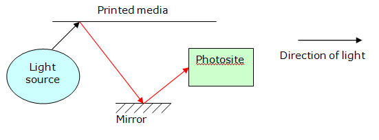 The above diagram is not accurate but does give an interaction on what actually occurs. A light source will aim a beam of light at the printed media. The light will then be reflected and will be a different colour, based on what part of the document it reflected off. This is shown in the diagram as the beam turning red. A mirror (or collection of mirrors) will then direct the beam into the photosite.
