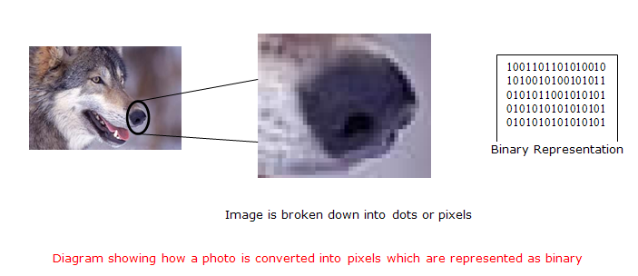 When an image is digitised it is converted into a series of dots or pixels. The pixels are then stored as binary data. The exact mapping of pixel to binary is beyond the scope of this book and also varies depending on the type of picture it is. For example a JPEG binary format is much different from a TIFF or GIF.