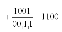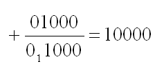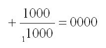 The first digit is 1 + 1 = 0 carry 1. The one is then carried over to the second digit. This then becomes 0 + 1 + 1 = 0 carry 1. The next digit becomes 0 + 0 + 1 = 1. Finally 1 + 0 + 0 = 1. As such the final answer becomes 1100. It is easy to check the answer by converting all of the binary into denary. 1100 is 12 and as you can see below, the above sum does indeed give 12. The next example shows what happens when the carry digit is passed on over the end. Effectivly it is lost. What actually has happened is that the numbers we are adding together have produced a value which can not be stored in 4 bits. As such the carry bit is said to overflow. A overflow in a binary addition means that the result will not be correct and that more bits may be needed. In 4 bits the largest value you can store is 15. 8 + 8 = 16 and as 16 is greater than 15 it will be impossible to perform this calculation in 4 bits. However if 5 bits were used then this calculation would be possible.