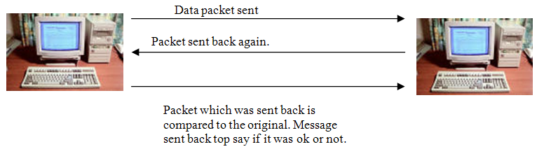 The echo method puts a lot of extra traffic onto the network, but it is conceptually a very simple idea. First of all the packet is sent from the source PC to the destination PC. The destination PC will then send the packet straight back. The destination PC will then compare this packet with the one it originally sent. If they are the same then nothing happens. If there is a difference then an error must have occurred. In this case the message is resent.
