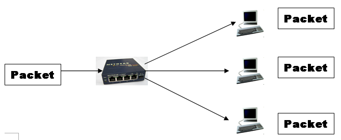 Hubs are effectively a bus network with the bus being inside the actual hub itself. They act as broadcast devices so when a packet of data arrives on a single port it is then broadcast out to all other ports. The diagram below demonstrates this. The diagram shows that the packet is sent to all three PC's connected to the hub. For small networks this is ok. However the more PC's connected the more traffic will be generated. If there are 30 PC's then every packet would be sent to all 30 of them. If each PC is constantly sending packets on the network then it will not take long of the network to run out of band width. |