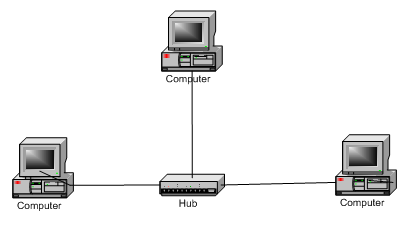 A hub allows more than one computer to be interconnected. NIC’s can be connected together by a single length of cable but this is not a good way to connect machines as if the cable breaks then all the PC’s will loose connectivity. When using a hub, each computer will use a cable each to connect to the network. As such if a single cable breaks it will only affect a single computer. When a message is sent to a hub it will tell all other computers connected to it about that message. Hubs can have up to 48 PC’s connected to them. Also hubs can be linked together to allow even more PC’s to connect. Each PC is connected to the hub by a cable into a port on the hub. The more ports on the hub the more PC’s which can be connected.