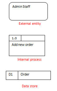 External entities represent anything from outside the system to be modeled. This tends to be some form of human input but could be anything such as a sensor or another separate system. Sometimes other external entities need to be involved in a data flow and these should be represented on the diagram, such as letting the warehouse staff know that a new order has been made. Internal process are where something is done with the input given. Add new order, for example, will save the order to the database as well as possibly validating the input. All processing which occurs will tend to happen in a internal process. A data store represents the database or anything else we can store data in such as a file. It is common on DFDs to only put return arrows if data, other than if the transaction was successful, is returned. The flow of data is shown via arrows. You can add a label to the arrow if you wish to express something such as the type or nature of the data to flow. If the flow is obvious then it is better to leave it blank so the diagram does not become cluttered.