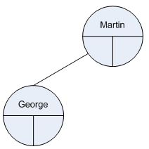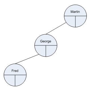 Fred is added to the left of George. Fred is less than Martin so must be placed on the left. As there is already a node there we must again go to the left.