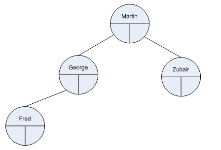 To construct a tree to store Martin, George, Fred and Zubair we add the elements in the order they are given.. So first of all we have Martin.
