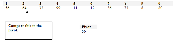 The first element of the list will become the pivot. Step 2 - Order all elements of the partition You must pass over all of the numbers in the list. Any number less than the pivot should be placed on the left partition while all numbers greater of equal to the pivot should be placed on the right.
