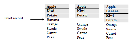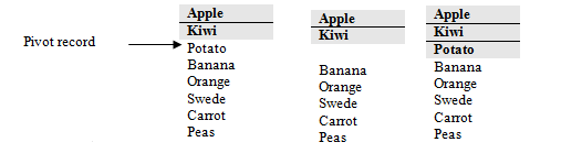 Potato gets inserted at the end of the sorted sub-list. The pivot record moves again to the next record. Banana gets placed into the temporary holding bay and then gets inserted back into the sorted sub-list.