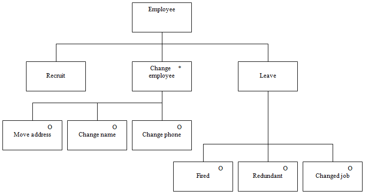 Change employee contains three possible actions. The OR operator, shown as an O, says that move address, change name or change phone will be mutually exclusive. That is only one will happen at once. However the change employee box says that it can happen numerous times.