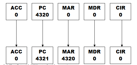 The first job to do is to fetch the instruction from the IAS. In order for a program to run it must have a start address. Below is a diagram of the main memory. The program will be stored within the IAS and the start address of that program will be loaded into the program counter register, PC. In this case the value in the PC will be 4320.