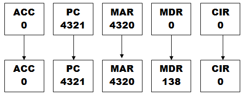 What ever is pointed to in the MAR at this stage is then copied into the MDR register. As such the MAR register stores the address of the next instruction while the MDR will store the actual instruction itself. The instruction will be encoded at this stage so will just be a binary number. For our example we shall use the binary number 1000 1010 which has the denary value of 138.