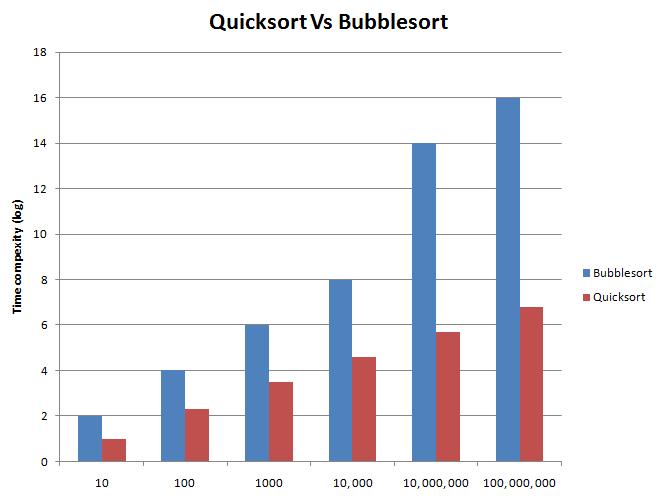 The difference between times, initially, is not too big. However as the input gets bigger the difference gets much more significant. The chart below shows this. Due to the sizes of the values I have had to use logarithmic scaling but it does not change the rate at which bubblesort grows against quicksort.