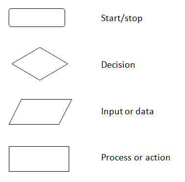The above symbols are used in a flowchart. There are others but these are the main ones. A flowchart is a classic way of representing problems in a serial manner. It allows selection through decision boxes, itteration using feedback lines and access to variables through the process box. Input is handled by the input box. The diagram below shows a simple algorithim which adds up the numbers 1 to 10 and outputs the result.
